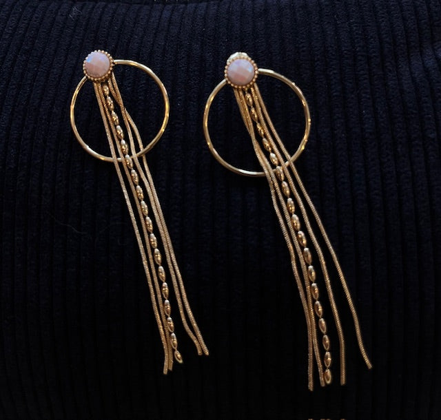 Apportez une touche de sophistication à votre look avec ces boucles d'oreilles pendantes au design fin et délicat. Composées d'un anneau doré rehaussé d'une pierre blanche aux reflets rosés, elles se prolongent par de fines chaînes dorées qui dansent avec légèreté à chaque mouvement.