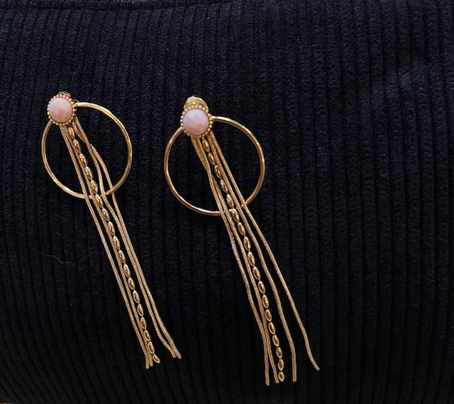 BOUCLES D'OREILLES PENDANTES DOREES À CHAINES ET PIERRE ROSEE