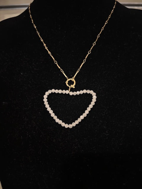 Elégant et délicat, ce collier met en valeur un pendentif en forme de coeur composé de fines perles translucides soigneusement assemblées. Suspendu à une chaîne dorée aux maillons allongés, il allie finesse et modernité. Le fermoir circulaire doré apporte une touche raffinée et renforce le charme du design.