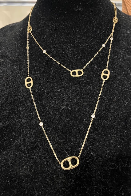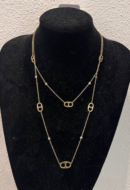 Sublimez votre tenue avec ce collier raffiné au design délicat. Composé d'une fine chaîne dorée, il est orné de maillons ovales ajourés et de petites pierres lumineuses subtilement dispersées le long du bijou.