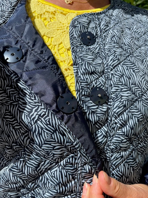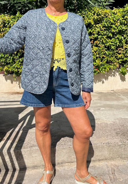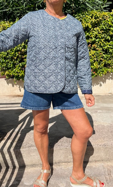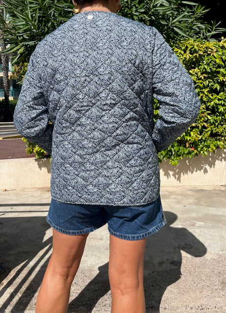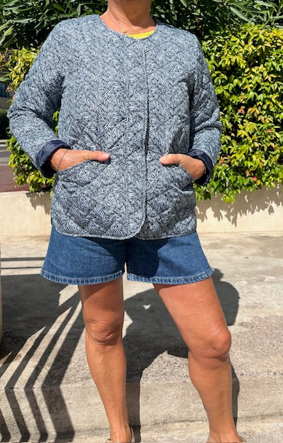 Découvrez cette magnifique veste matelassée qui allie style et polyvalence. Confectionnée dans un tissu léger et confortable, elle présente un superbe motif graphique abstrait en marine et bleu ciel d’un côté, et un uni marine élégant de l’autre.
