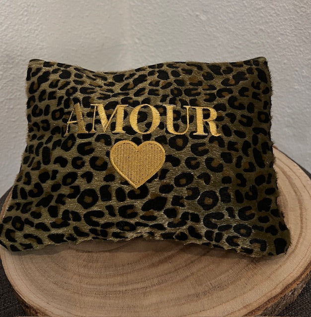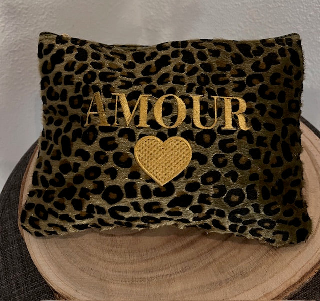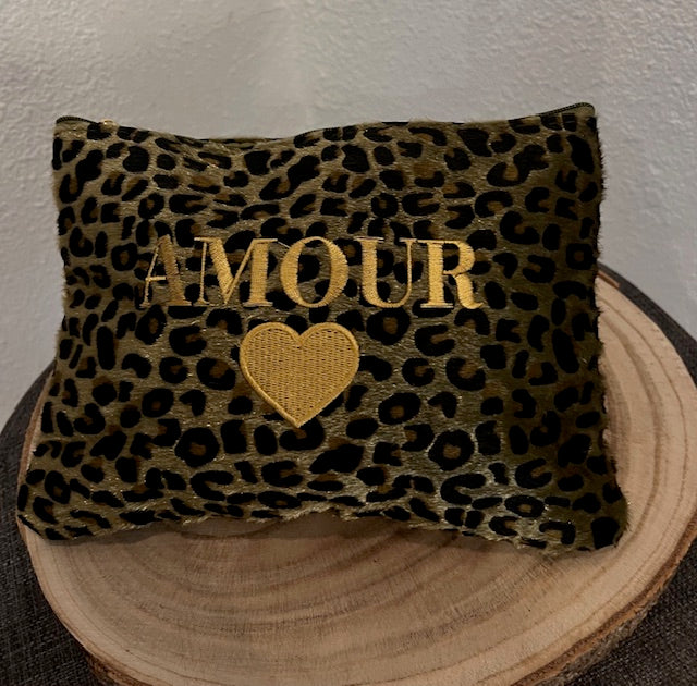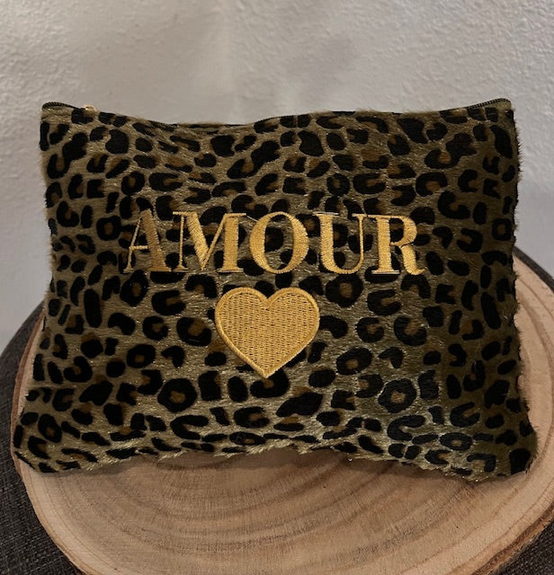 On aime : Le léopard chic dans des tons kaki, la broderie dorée "AMOUR" pleine de caractère, son format pratique pour un usage quotidien.