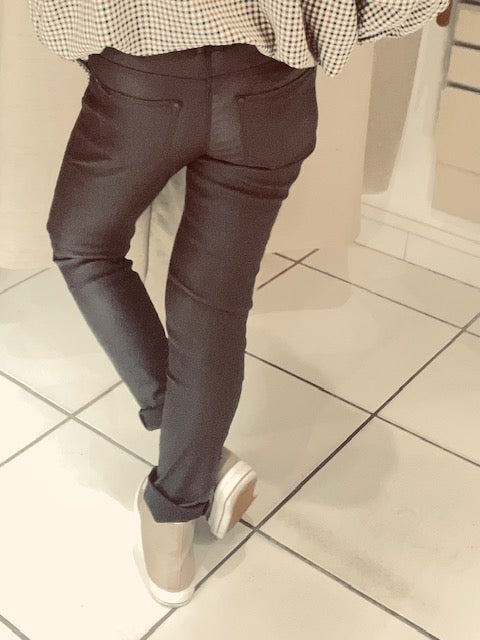 Ce pantalon enduit couleur chocolat est une pièce phare pour un look à la fois élégant et tendance. Sa texture effet cuir apporte une touche de modernité tout en restant souple et agréable à porter.